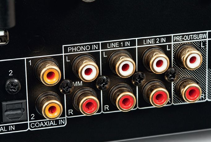 W sekcji wejść analogowych mamy dwa liniowe oraz jedno gramofonowe (MM), w sekcji wejść cyfrowych - dwa współosiowe oraz dwa optyczne.