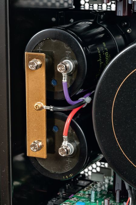 Z kolei zaciski głośnikowe są podłączone bezpośrednio do płyty, bez dodatkowych przewodów; w ten sposób usunięto kolejne miliomy z sumarycznej impedancji wyjściowej wzmacniacza. Wzmacniacz słuchawkowy to niezależny moduł złożony z elementów dyskretnych.