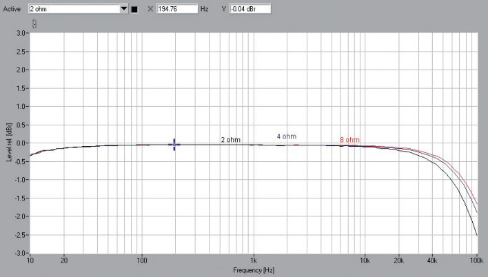 Dlatego nawet bez "wybuchowej" mocy dynamika osiąga aż 111 dB. E-650 świetnie sobie radzi również w pomiarze charakterystyk częstotliwościowych (rys.1), który uwzględnia tym razem trzy wartości obciążeń. Widać dobrą zbieżność krzywych, spadek przy 100 kHz wynosi ok. -1,5 dB dla 8 Ω, ok. 2 dB dla 4 Ω i 2,5 dB dla 2 Ω.