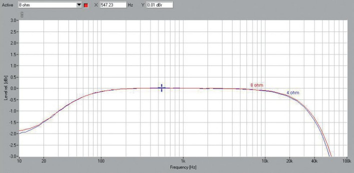 Na charakterystyce przenoszenia (rys.1) widać niewielkie osłabienie w zakresie niskotonowym (niecałe 2 dB przy 10 Hz), a spadek -3 dB w zakresie wysokich tonów pojawia się dopiero przy 65 kHz. Wykres dla obydwu impedancji wygląda właściwie identycznie, co dobrze świadczy o transformatorach głośnikowych.