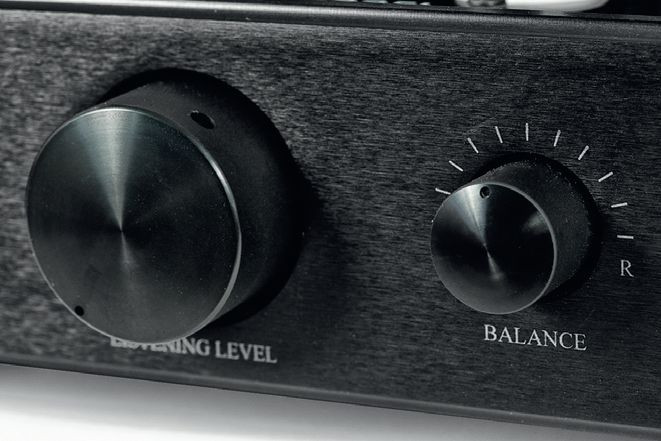 Z przodu, oprócz włącznika zasilania, pokrętła głośności i selektora wejść, jest jeszcze dość zaskakujący manipulator zrównoważenia kanałów. Wszystkie regulacje są mechaniczne, pracują albo z klasycznymi potencjometrami, albo z obrotowymi przełącznikami.
