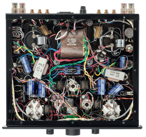 Kompaktowa budowa wymusiła specjalne ustawienia, transformatory skręcono o niewielki kąt, zyskując kilka cennych milimetrów. Ostatecznie górna płyta zmieściła wszystkie elementy, a więc komplet transformatorów i lamp w konfiguracji iście arystokratycznej.