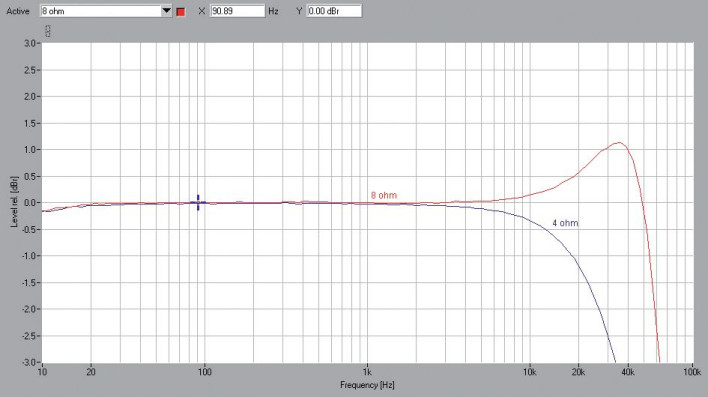 Charakterystyka przenoszenia (rys.1) pokazuje wciąż pojawiające się (a niegdyś powszechne) dolegliwości wzmacniaczy w klasie D. Powyżej ok. 5 kHz zaczyna się wzrost dla obciążenia 8 Ω (i podbicie ok. 1 dB przy 33 kHz) albo spadek dla 4 Ω; punkty -6 dB wyznaczymy odpowiednio dla 33 KHz i 62 kHz.