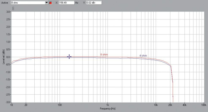 Primare deklaruje moc I15 jako 2 x 60 W przy 8 Ω i 2 x 100 W przy 4 Ω, ale w teście wzmacniacz szybko nas przekonał, że producent niedoszacował. I15 przy 8 Ω dostarcza 80 W, a przy 4 Ω - 150 W w każdym kanale i wartości nie zmieniają się w trybie dwukanałowym. Czułość trzyma się standardu 200 mV (na jedynym wejściu analogowym, cyfrowych ten parametr nie dotyczy).