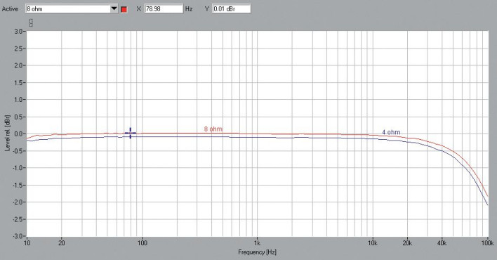 Charakterystyka przenoszenia (rys.1) wygląda doskonale, przy 10 Hz poziom trzyma się referencyjnych 0 dB, a spadek przy 100 kHz wynosi ok. 2 dB. Najsilniejszą harmoniczną w spektrum z rys. 2. jest (dość nietypowo) piąta, jej poziom to jednak umiarkowane -83 dB. Na granicy -90 dB leżą druga i siódma. Z charakterystyk na rys. 3. odczytamy, że THD+N poniżej 0,1% pojawiają się od mocy 3,8 W przy 8 Ω i 7 W przy 4 Ω, a krzywe mają kształt typowy dla wzmacniaczy tranzystorowych w klasie AB.