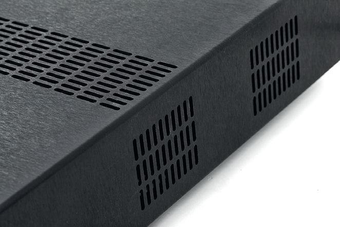 Nie udało mi się "przyłapać" wiatraków na większych obrotach, przyspieszają prawdopodobnie dopiero po dłuższej pracy z wysoką mocą (na niskich impedancjach), gdy wzmacniacz osiąga znacznie wyższą temperaturę. Jednak ze względu na układ chłodzenia (powietrze zasysane jest tylną ścianką, a ciepło wypychane szczelinami z góry i boków), nie wolno niczego na Vanguardzie ustawiać.