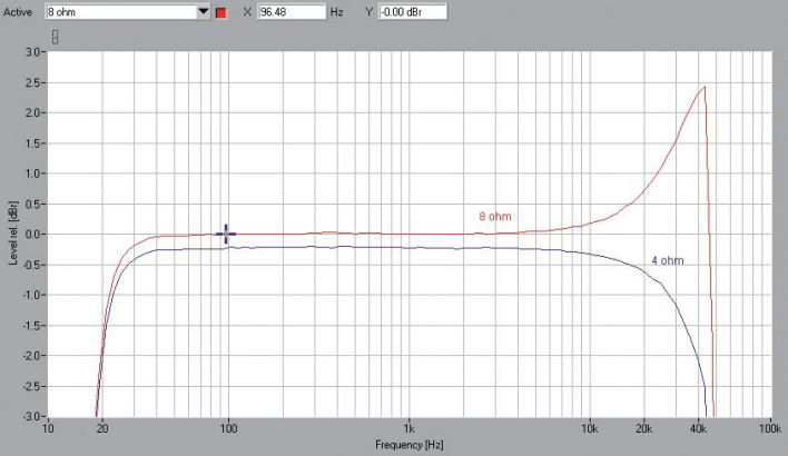Zgodnie ze specyfikacją wzmacniacz powinien wykazać się mocą 210 W przy 8 Ω i 420 W przy 4 Ω. Dokładnie takie wyśmienite wyniki uzyskaliśmy w naszych pomiarach. Co więcej, moc nie spada ani o jotę przy wysterowaniu dwóch kanałów równocześnie.