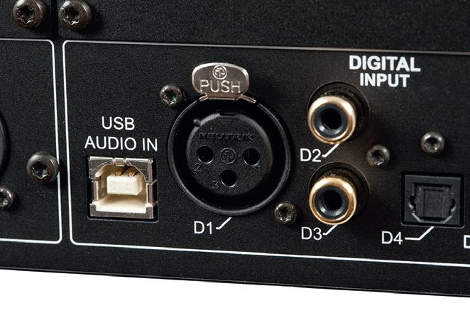 Cyfrowe wejścia współosiowe, optyczne oraz AES/EBU przyjmują sygnały PCM 24 bit/192 kHz, najwięcej potrafi USB-B (za pomocą zewnętrznego urządzenia, np. komputera), które sięga PCM 32 bit/384 kHz i DSD128.