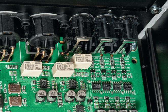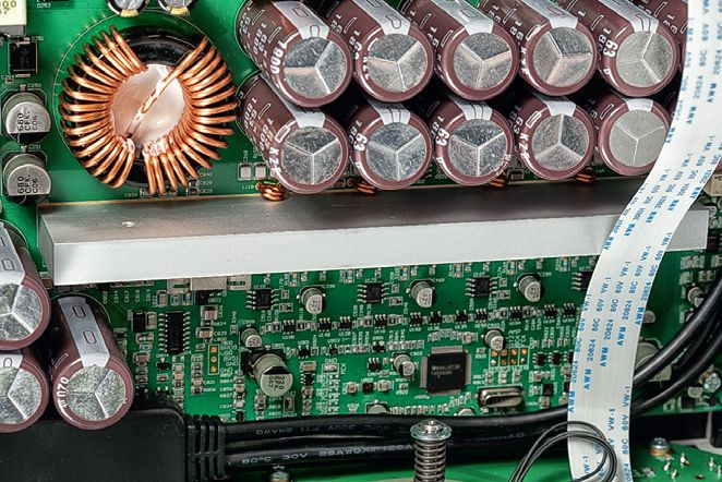 W końcówkach mocy zastosowano tranzystory marki Infineo Technologies, zamontowane do niewielkiego, metalowego “słupka". Za końcówkami mocy widać układ analogowych, pasywnych filtrów wyjściowych - "rekonstrukcyjnych". To konieczność, ale i słaby punkt większości wzmacniaczy impulsowych, w sekcji laboratoryjnej sprawdzimy, jak poradził sobie z tym Lyngdorf.