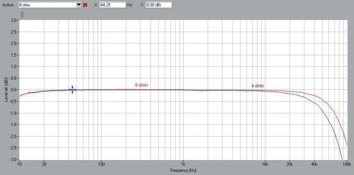 Na charakterystykach przetwarzania (rys.1) wszystko wydaje się już być w najlepszym porządku. Przy 100 kHz spadek wynosi -2,5 dB dla 8 Ω i -3 dB dla 4 Ω.