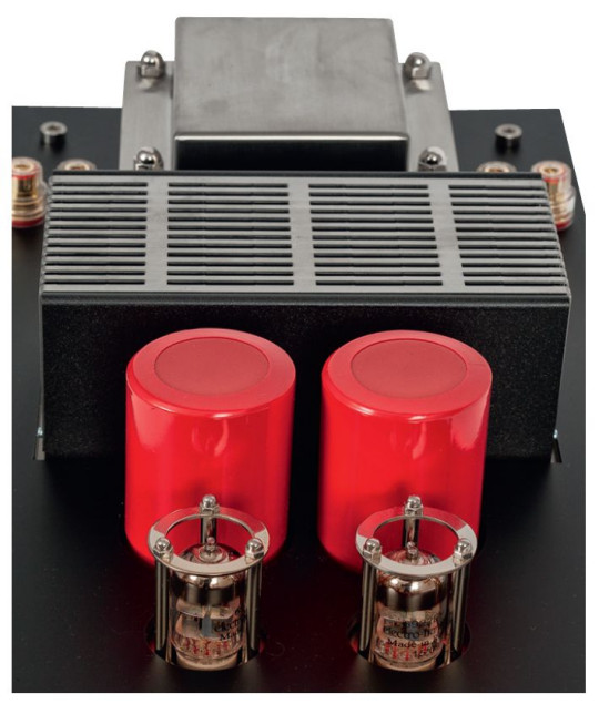 Na górze wyeksponowano lampy, chronione przez koszyczki (to wymóg UE). Za nimi wychodzą czerwone walce kondensatorów i ustawiony na sztorc radiator. Całą "maszynerię" wieńczy blok transformatora zasilającego z osłoną ze stali nierdzewnej.