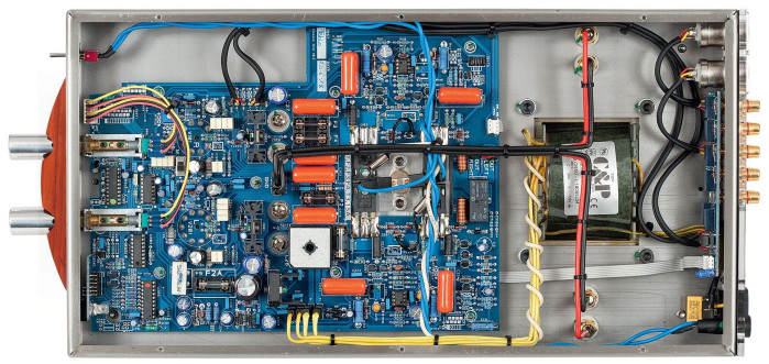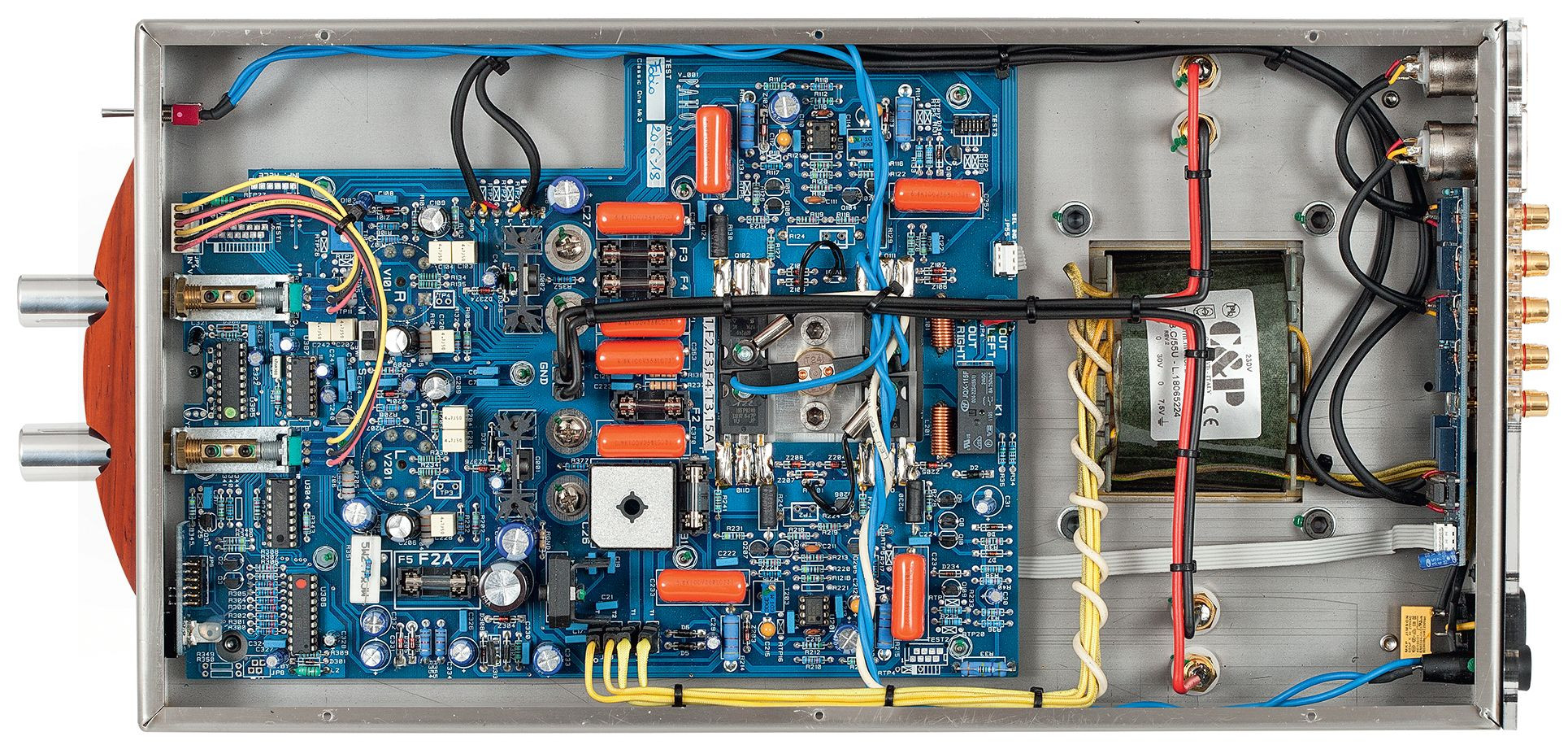 Sygnał z gniazd wejściowych jest prowadzony starannie ułożonymi wiązkami przewodów. Regulacja wzmocnienia odbywa się w scalonym tłumiku marki Burr Brown. To jedna z tych sekcji, którą przebudowano względem modelu Mk II (tam regulator pochodził od Cirrus Logic). Sekcja przedwzmacniacza jest zbalansowana i pracuje w czystej klasie A. Odważnie zrezygnowano ze sprzężenia zwrotnego.