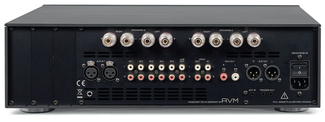 Na tylnej ściance AVM A5.2 są dwie pary wyjść głośnikowych, aż pięć wejść liniowych RCA i jedno zbalansowane XLR. Jest też wyjście na rejestrator, dodatkowa pętla dla procesora wielokanałowego oraz dwa wyjścia z sekcji przedwzmacniacza (jedno RCA i jedno XLR). Przy instalacjach mogą się przydać wyjścia wyzwalaczy i wejście na zewnętrzny czujnik podczerwieni.