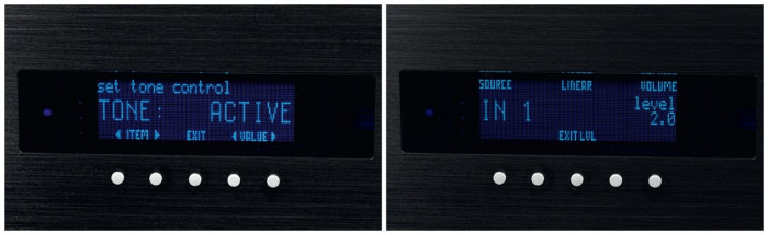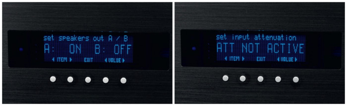 Po wejściu do menu możemy dodatkowo regulować barwę dźwięku (w tej sekcji zawarto też filtr loudness), zrównoważenie kanałów, zmienić konfigurację wyjść głośnikowych czy uruchomić tryb integracji z (zewnętrznym) procesorem wielokanałowym. Możliwa jest indywidualna, precyzyjna kalibracja czułości dla każdego z wejść (dodatkowo mamy ogólną redukuję o 6 dB).