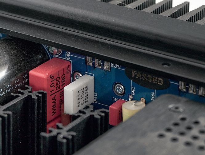 Każdy kanał ma już własną sekcję filtrującą, 60 000 mF każda. Drugi transformator, znacznie mniejszy, wraz z drugą gałęzią zasilacza, odseparowaną od sygnałów audio, jest przypisany do wyświetlacza oraz układów sterujących. Po każdej ze "stron" końcówek mocy zainstalowano dwie pary doskonale znanych tranzystorów wyjściowych Sankena.
