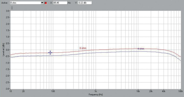 Odstęp od szumów jest przyzwoity (-83 dB), a dynamika sięga 105 dB. Charakterystyki przenoszenia (rys.1) pokazują spadek poniżej 700 Hz, co jednak należy traktować wyłącznie jako ciekawostkę ( w tym zakresie charakterystyki wzmacniaczy są zwykle idealnie liniowe) niż faktyczny problem, jest to bowiem obniżenie o kilka dziesiątych decybela, a nawet przy 10 Hz spadek nie przekracza -0,5 dB, co w praktyce nie będzie słyszalne. W zakresie najwyższych, i to już ponadakustycznych częstotliwości, Diablo radzi sobie wyśmienicie, skoro przy 100 kHz notujemy spadek mniejszy od 1 dB, i to dla obydwu impedancji.