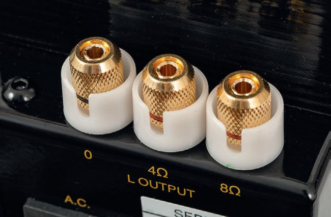 Wyjścia głośnikowe są niezależne dla obciążeń 8- i 4-omowych, trzpienie zainstalowano pionowo, tuż za transformatorami. To rozwiązanie nietypowe, z jednej strony ułatwia podłączanie przewodów, z drugiej - utrudnia ich maskowanie (zwłaszcza w przypadku bananków).