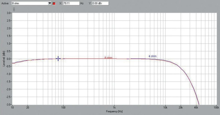 Częstotliwościowe charakterystyki przetwarzania (rys. 1) to dla wzmacniaczy lampowych też trudny sprawdzian, ze względu na ograniczenie pasma wprowadzane przez transformatory wyjściowe. Tym razem jest dobrze, pomiary zostały wykonane dla 8 i 4 Ω oraz odpowiednich odczepów (napięcia referencyjne zostały dla łatwego porównania znormalizowane), charakterystyki idealnie się pokrywają, spadek przy 10 Hz jest pomijalny (-0,3 dB), a w zakresie wysokich tonów spadek -3 dB pojawia się przy 44 kHz.