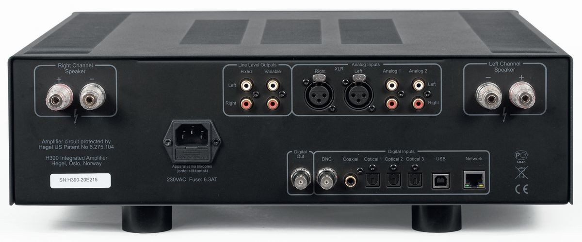 Przedwzmacniacz umieszczono z tyłu. Sygnały z wejść analogowych są przełączane w przekaźnikach. Sekcja cyfrowa znajduje się piętro niżej. Hegel H390 trzyma się konwencjonalnych układów w klasie AB ze sprzężeniem zwrotnym, jest daleki od brawurowych rozwiązań i wcale się tego nie wstydzi.