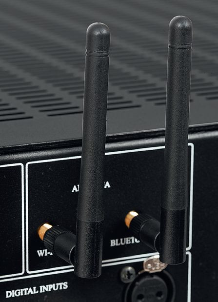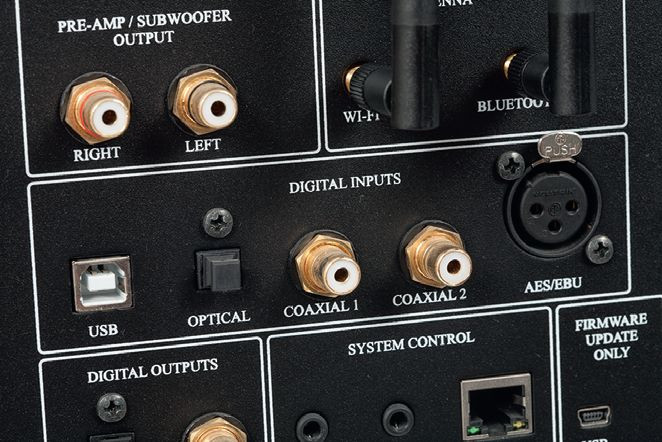Cary Audio SI-300.2D ma aż pięć wejść cyfrowych: dwa elektryczne współosiowe, po jednym optycznym, USB i AES/EBU. Są też dwa cyfrowe wyjścia (jedno optyczne i jedno współosiowe). W ich pobliżu zauważymy anteny systemu Bluetooth (z kodowaniem aptX) oraz Wi-Fi. Do sieci można włączyć się także przewodowo (LAN), ale nie jest to możliwość strumieniowania, a wyłącznie komunikacji sygnałów sterujących.