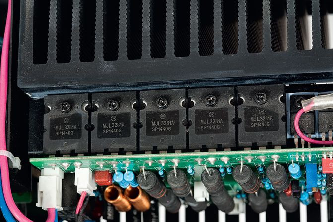 Blok końcówek mocy ma formę pionowej płytki obok radiatora, w którego centrum znajduje się czujnik termiczny. Końcówki to układ złożony z dziesięciu (na każdy kanał) tranzystorów wyjściowych. Na zdjęciach widać tylko połowę z nich, drugą ulokowano za dolnym wycięciem w module radiatora.