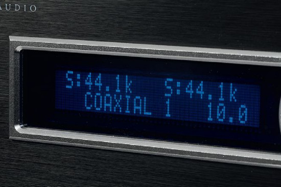 W lewym oknie umieszczono bardziej typowy (dla nowoczesnego wzmacniacza) wyświetlacz wielofunkcyjny, pokazujący poziom głośności, wybrane wejście i o wiele więcej.