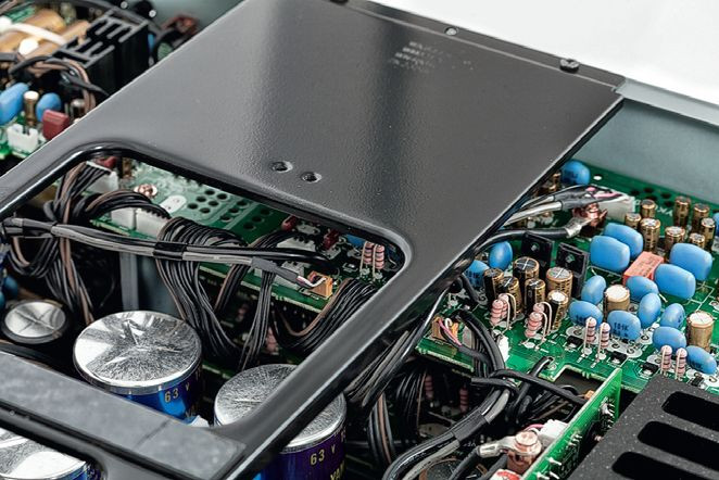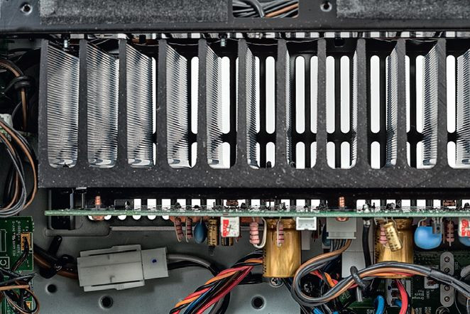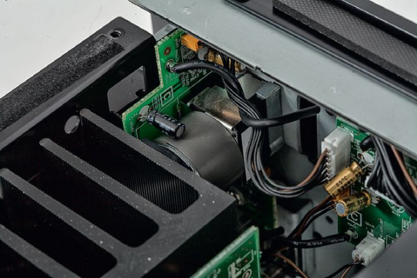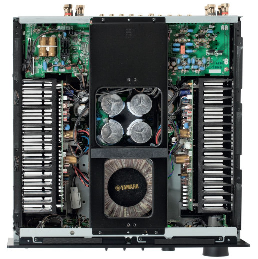 Duży transformator toroidalny odsunął od siebie niezależne moduły końcówek mocy, każdy z własnym radiatorem i sporą płytką drukowaną. W każdym kanale pracuje para tranzystorów wyjściowych (trudny dostęp do końcówek uniemożliwił ich identyfikację) - to niby rozwiązanie skromne, ale bardzo zbliżone Yamaha stosuje nawet w najdroższym A-S3200 i - jak się w przekonamy w laboratorium - bardzo skuteczne pod każdym względem.