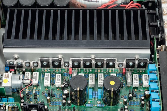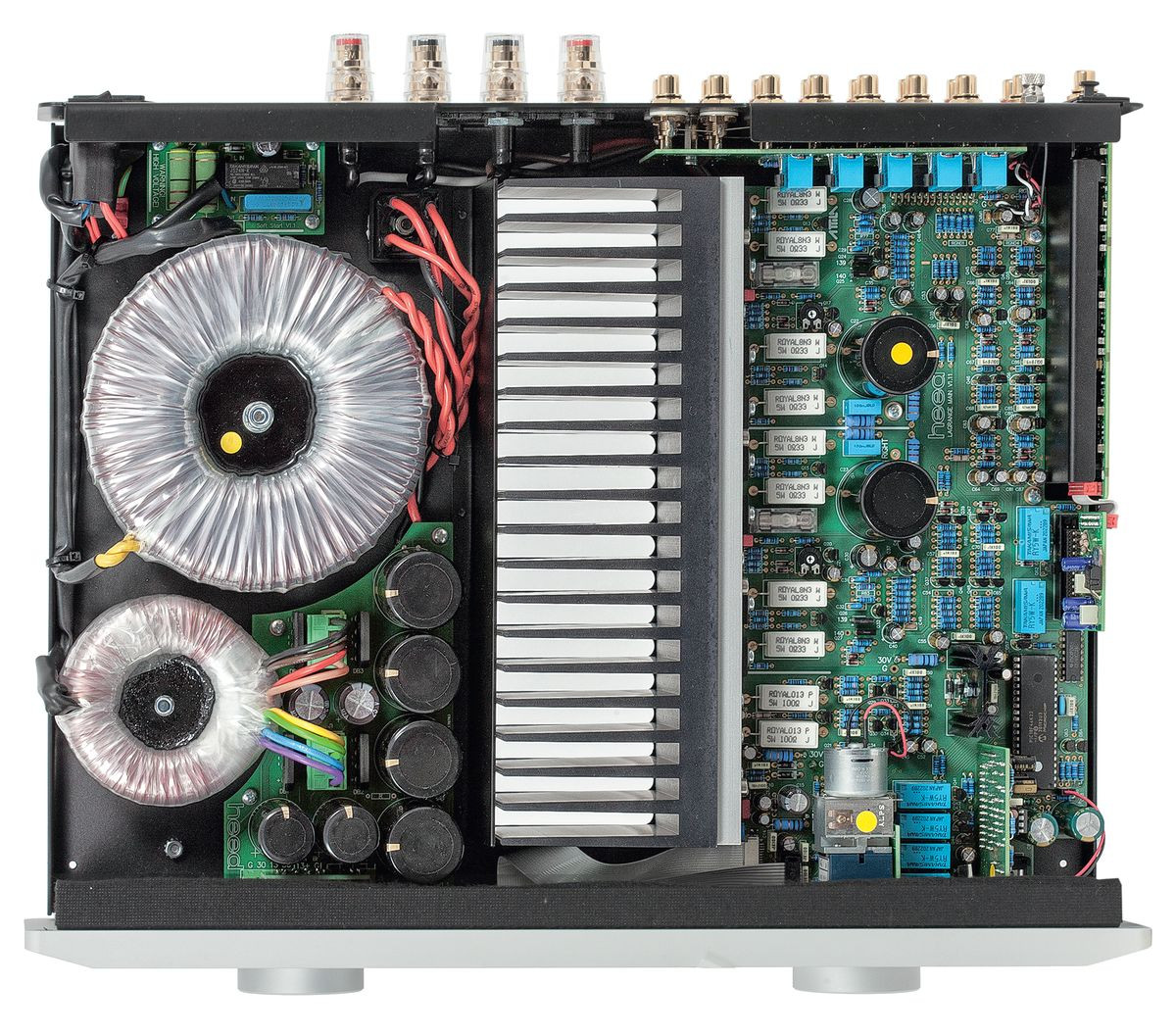 Radiator dzieli wnętrze na dwie sekcje. Po jego jednej stronie ulokowano zasilacz z dwoma transformatorami toroidalnymi. Większy służy końcówkom mocy (mając dwa uzwojenia wtórne, niezależnie dla każdego kanału), mniejszy – przedwzmacniaczowi.