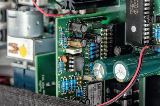 Sporo miejsca zajmuje przedwzmacniacz gramofonowy. Nie jest to "pierwszy lepszy" gotowiec na scalakach, ale układ na elementach dyskretnych. Obwód wejściowy zawiera hermetyczne przekaźniki w roli przełączników wejść, a regulator głośności to klasyczny potencjometr firmy Alps (chociaż z silniczkiem, zdalnie sterowany), dlatego wskazania głośności nie pojawiają się na wyświetlaczu.