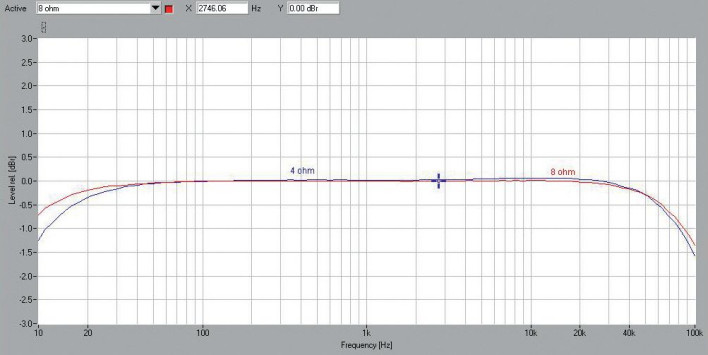 Charakterystyki częstotliwościowe (rys. 1) pokazują spadek ok. -1,5 dB przy 100 kHz, co jest dobrym osiągnięciem, natomiast na drugim skraju, przy 10 Hz, chociaż spadek nie jest bezwzględnie większy, to nietypowy; -0,7 dB dla 8 Ω; -1,3 dB dla 4 Ω.