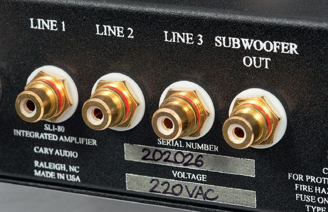 Na tylnej ściance Cary Audio SLI-80HS mamy przedsmak wewnętrznej konstrukcji i symetrycznego podziału na dwa kanały. Wzmacniacz ma trzy wejścia liniowe, nie ma przedwzmacniacza gramofonowego, sekcji cyfrowej ani żadnego systemu modułów rozszerzeń.