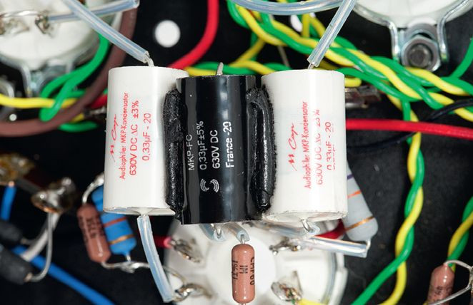 SLI-80HS został też dopieszczony lepszymi elementami pasywnymi (kondensatory, rezystory). Montaż jest w dużym zakresie ręczny, co widać w porównaniu Cary Audio SLI-80HS z Evo 400.