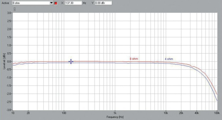Niska czułość pomaga ustalić wysoki odstęp od szumu, jednak tutaj nie jest on rekordowy – 82 dB, lecz dzięki wysokiej mocy dynamika osiąga 108 dB. Charakterystyki przetwarzania (rys.1) wyglądają obiecująco, spadki są pomijalne przy 10 Hz, a przy 100 kHz umiarkowane -2/-2,5 dB (8/4 Ω).