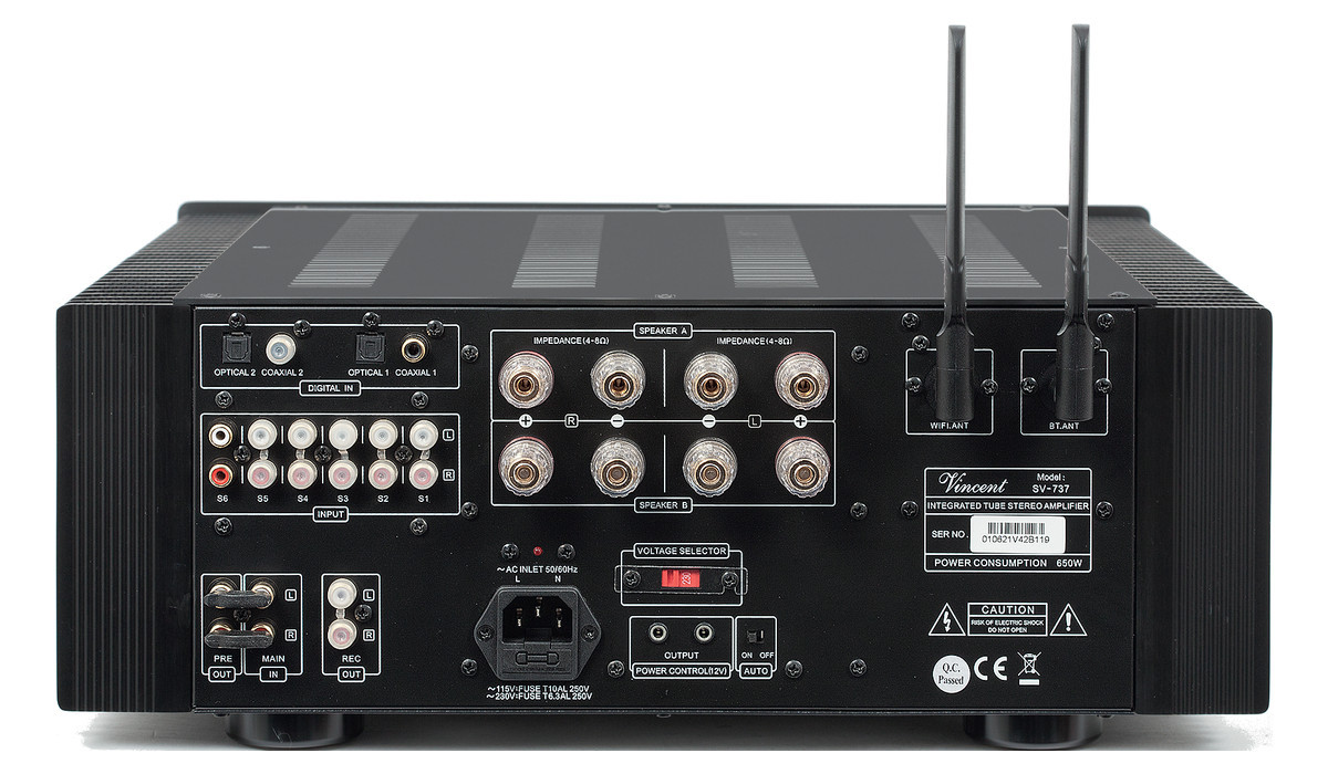 Nie ma niezależnego wyjścia z przedwzmacniacza, jest za to wyjście RCA o stałym poziomie napięcia, przygotowane dla rejestratora. Wyjścia głośnikowe są zdublowane, a obok nich dwie anteny, Wi-Fi oraz Bluetooth, podpowiadają, że mimo wszystkich "zaszłości" jest to Vincent nowej generacji.