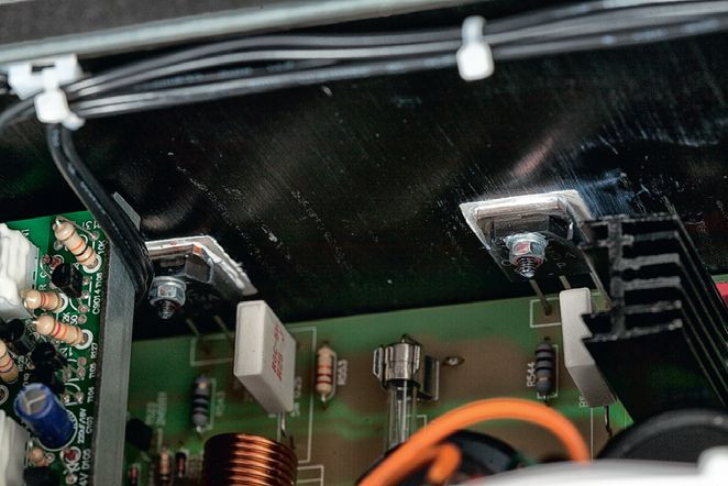 W każdym kanale mocy wykorzystano dwie pary tranzystorów wyjściowych - 2SA1386/2SC3519 firmy Sanken. Przetworniki C/A Burr Brown PCM5102A obsługują sygnały nawet do 32 bit/384 kHz, chociaż bez USB-B nie możemy takich dostarczyć.