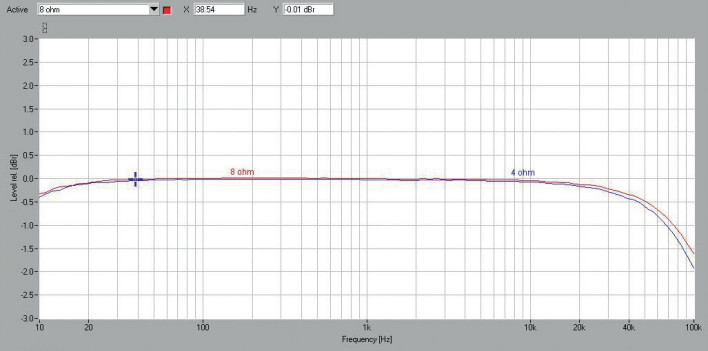 Producent obiecuje 2 x 180 W przy 8 Ω oraz 2 x 300 W przy 4 Ω, co zapewnia tranzystorowa końcówka mocy, ale specyfi ka tego wzmacniacza, również pod względem pomiarowym, zawarta jest w lampowej sekcji przedwzmacniacza. Zwykle donosimy o wyższych mocach niż w fi rmowych specyfi kacjach. Tym razem jest jej odrobinę mniej: przy 8 Ω – 177 W, zarówno przy wysterowaniu jednego, jak i dwóch kanałów jednocześnie, a przy 4 Ω – 2 x 298 W i przy wysterowaniu jednego – 329 W.