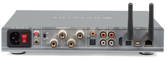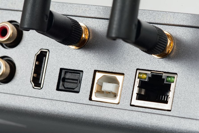 Są też dwa wyjścia cyfrowe – optyczne i elektryczne. NuPrime Omnia A300 ma złącze LAN i dwa gniazda antenowe, prawdopodobnie w podziale Wi-Fi/Bluetooth (bo taką transmisję wzmacniacz obsługuje). Bluetooth zapewnia kodowanie aptX HD i działa dwukierunkowo – wzmacniacz odbiera więc sygnał ze źródeł i potrafi wysłać go do (bezprzewodowych) słuchawek.
