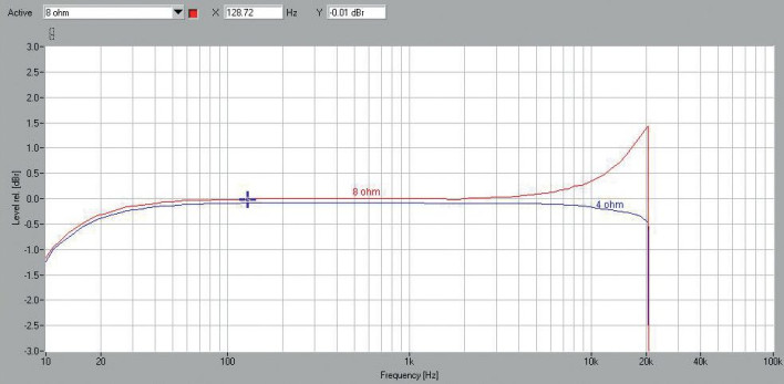 Charakterystyki częstotliwościowe (rys. 1) ujawniają typowe dla wielu wzmacniaczy impulsowych kłopoty z liniowością przetwarzania, zwykle większe dla jednej z impedancji, i zwykle jest to 8 omów - tak jak w tym przypadku; widać ok. 1,5 dB podbicie wynikające z wpływu filtrów wyjściowych (obciążenie filtra wyższą impedancją niż dla niego optymalna, wywołuje podbicie tuż przed spadkiem, a niższą – łagodniejszy, wcześniejszy spadek). Zatem przy obciążeniu 4-omowym nie ma podbicia. Obydwie krzywe dotyczą ustawienia trybu 8-omowego, jak widać nawet on jest lepiej dopasowany do obciążenia 4-omowego niż do 8-omowego.