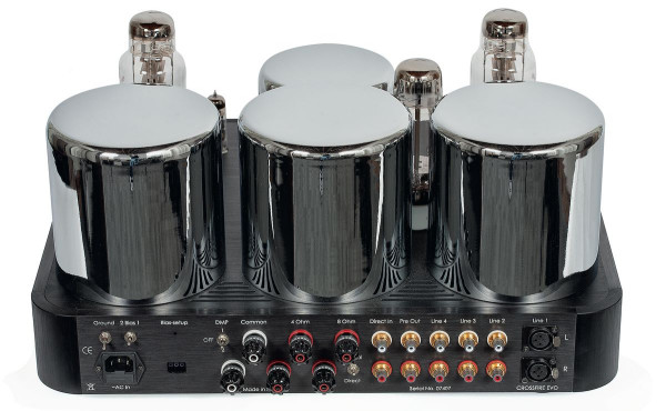 Aluminiowa rama obudowy jest anodyzowana i szczotkowana, Crossfire Evo ma też wiele innych, typowych dla Ayona elementów, takich jak podświetlane na czerwono, efektowne logo, wygodne, nacinane pokrętła i duże chromowane obudowy transformatorów. Z niskiej obudowy "wyrastają" też lampy, bez żadnych osłon. Pięknie i hardcorowo.