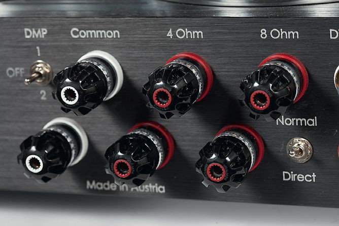 Crossfire Evo ma oddzielne zaciski dla obciążeń 8- i 4-omowych, wyprowadzone z różnych odczepów transformatorów wyjściowych. W wielu wzmacniaczach lampowych wygląda to inaczej – zacisków jest jeden komplet, a przełączenie między odczepami jest rolą przełącznika; właśnie takiego, jaki widzimy tutaj w roli DMP.