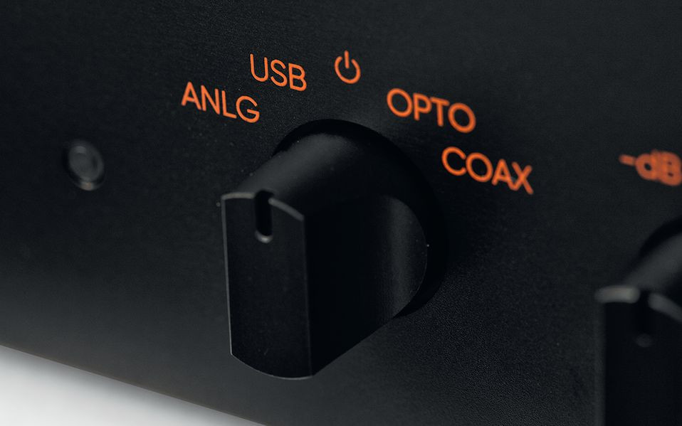 Pierwsze z pokręteł to przełącznik źródeł, a jeżeli żadne z nich nie zostanie wybrane, może też odciąć zasilanie (w pozycji pionowej). W tej sytuacji, przełączając między źródłami, musimy przejść przez pozycję wyłączenia urządzenia. Wejściu analogowemu przydzielono diodę sygnalizacyjną.