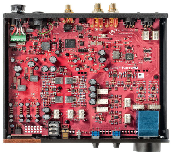 Ferrum stosuje więc układ ESS Technology ES9028PRO, obecnie jeden z nowocześniejszych konwerterów. ES9028PRO obsługuje nawet sygnały PCM 32/768 oraz DSD1024, czego jednak sam Ferrum Erco nie potrafi prawdopodobnie ze względu na konfigurację interfesjów wejściowych. Bezpośrednio przy przetworniku widać kość zegara taktującego oraz rozbudowane stabilizatory napięcia zasilającego.