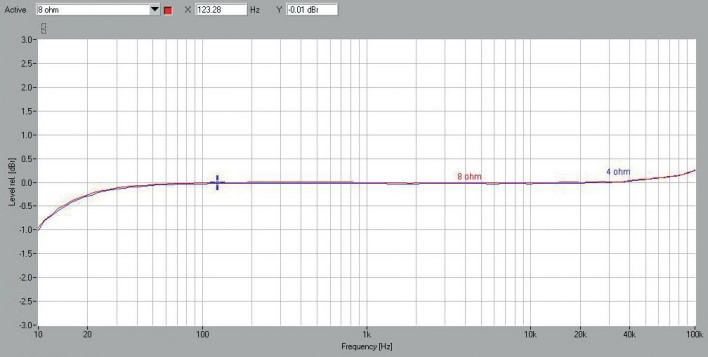 Charakterystyki częstotliwościowe (rys. 1) prezentują się bezproblemowo, przy 10 Hz mamy nieszkodliwy spadek -1 dB, a przy 100 kHz jeszcze mniej istotny, chociaż nietypowy wzrost o 0,3 dB.