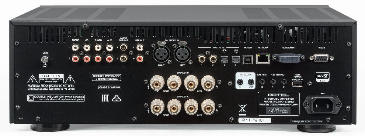 Są (analogowe) wyjścia z przedwzmacniacza - jedno stereofoniczne (dla dodatkowej końcówki mocy) i dwa monofoniczne (dla subwooferów). W tylną ściankę wkręcono także (typową dla Rotela) kapsułkę z modułem Bluetooth (kodowanie aptX oraz AAC).