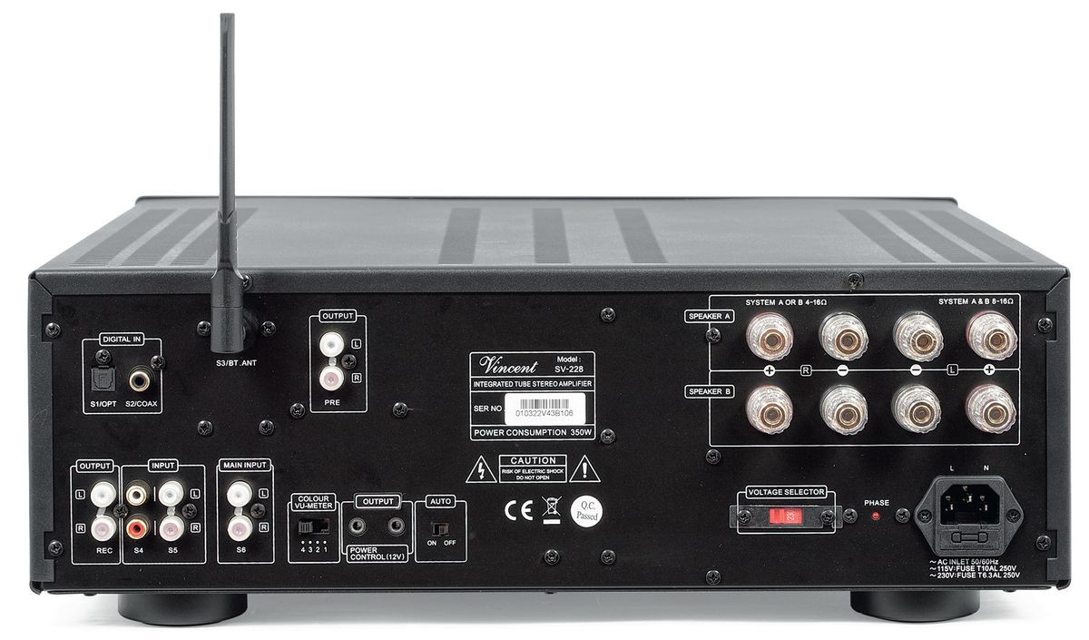 Vincent SV-228 pozwala podłączyć w sumie sześć źródeł sygnału – trzy cyfrowe i trzy analogowe – wliczając w to bezprzewodowy Bluetooth (jako jedno ze źródeł cyfrowych) i urządzenie podłączone bezpośrednio do końcówki mocy (a więc wyposażone w regulację poziomu).