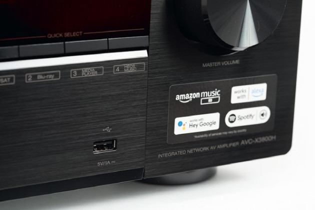 Panel podręczny stracił na znaczeniu, widać to nie tylko w Denon AVC-X3800H. Na froncie zostało USB ale i ono nie jest już elementem strategicznym. Do odtwarzania muzyki z plików służy telefon, a ten połączy się bezkablowo.