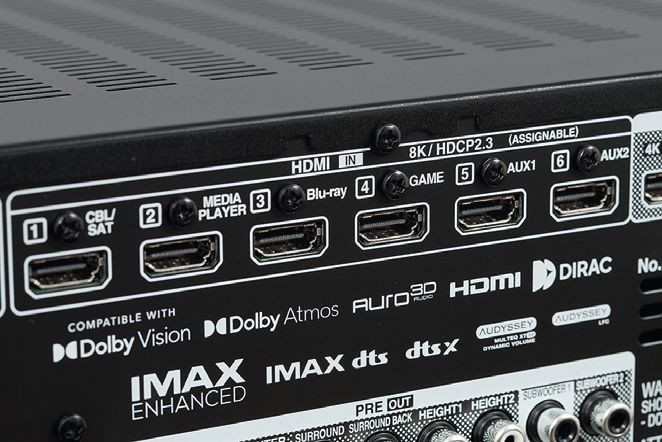 Źródeł analogowych (audio) może być siedem, w tym jedno gramofonowe (dla wkładek MM). W AVC-X3800H jest sześć wejść HDMI (z tyłu), wszystkie mogą przyjąć sygnał 8K.