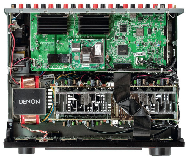 W sekcji audio bez niespodzianek – Denon wciąż stosuje wszechstronne procesory Analog Devices z rodziny Sharc, które umożliwiają skomplikowane operacje, jakich wymagają współczesne standardy surround.