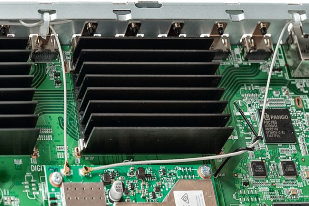 W tylnej części obudowy zgromadzono układy cyfrowe. Na najwyższym piętrze ulokowano charakterystyczny moduł HEOS, do którego są podłączone dwie anteny (Wi-Fi i Bluetooth). Poniżej widać nową aranżację wideo z dwoma sporymi radiatorami (układy związane z HDMI również wymagają intensywnego chłodzenia).
