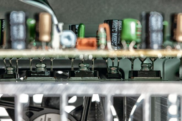 Końcówki rozdzielono między dwa radiatory – na jednym pięć, na drugim cztery. W każdej końcówce pracuje para tranzystorów, co jest utrwalonym zwyczajem Denona, spotykanym również w wysokiej klasy wzmacniaczach stereofonicznych (np. w PMA-1700NE opisanym w poprzednim numerze). Zasilacz jest oparty na transformatorze rdzeniowym.
